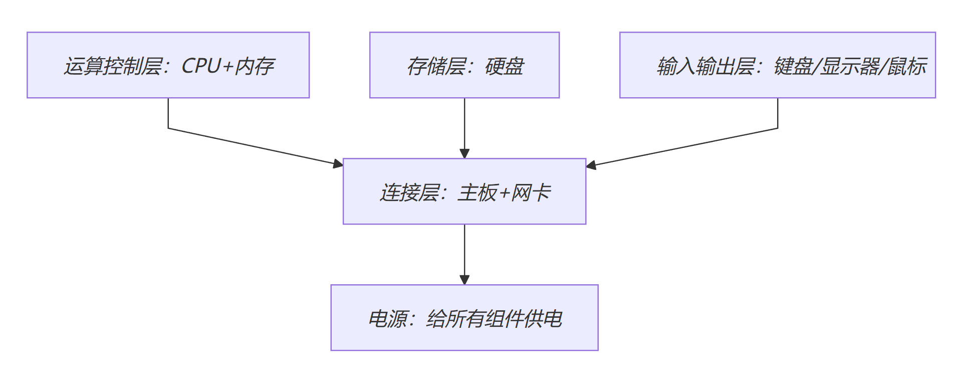 核心逻辑:CPU(大脑)负责计算,内存(临时工作台)存放待处理数据,硬盘(仓库)长期存数据,主板(工厂流水线)连接所有组件,电源(供电站)保障运行,网卡(通信员)实现网络连接。