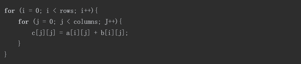 由于NumPy封装了大量的复杂计算方法,因此使代码变得极为简洁、高效。例如,对于两个数组a和b的加法操作,如果用C语言实现,则需要通过两层循环求和,代码如下: