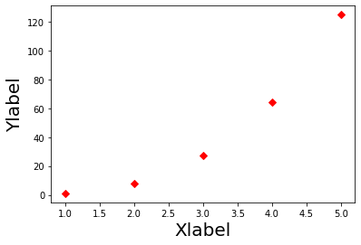plt.plot([1,2,3,4,5],[1,8,27,64,125],'D',color='r')
