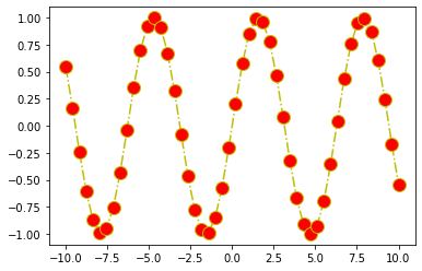 plt.plot(x,y,color='y',linestyle='-.',marker='o',markerfacecolor='r',markersize=12)